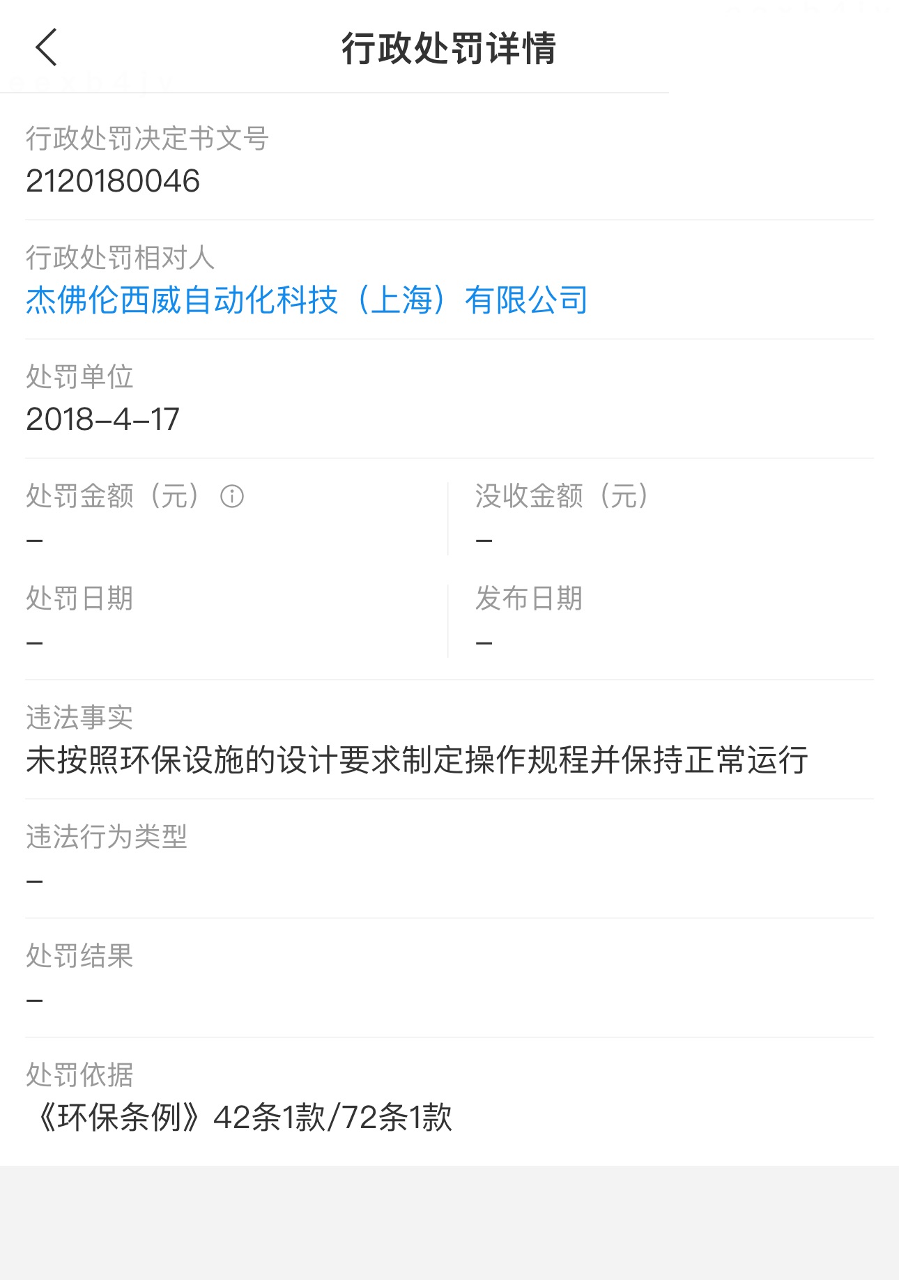 2018年4月17日,杰佛伦西威自动化科技(上海)有限公司未按照环保设施的设计要求制定操作规程并保持正常运行,被上海环保部门依据《环保条例》42条1款/72条1款进行违法处罚。