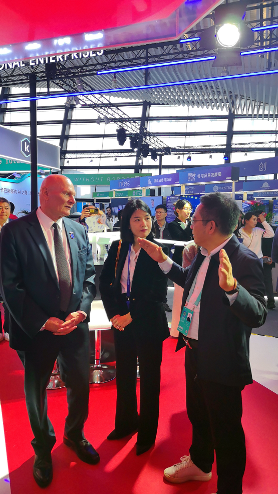 (星际航总经理徐文向GSMA Ltd.首席执行官John Hoffman介绍星际航区县2.0产品)
