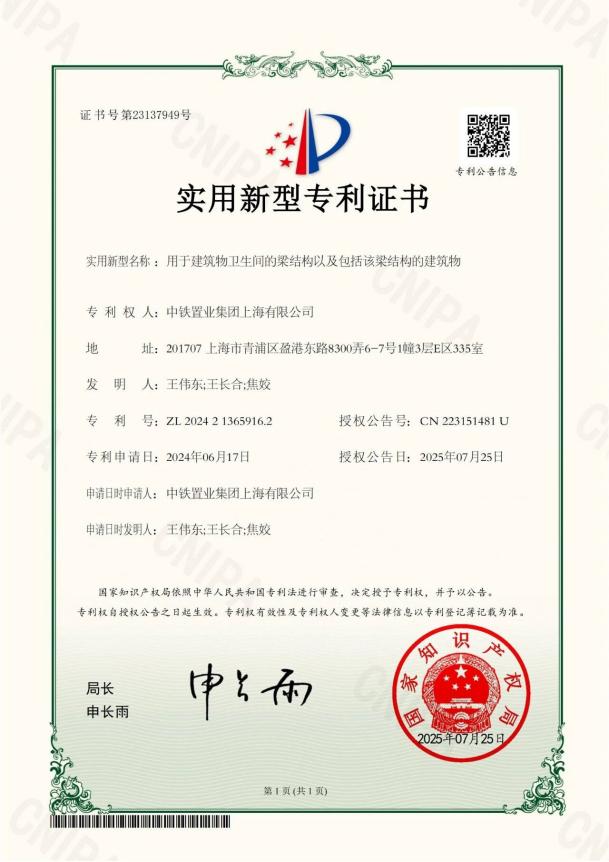 近日,中铁置业上海公司自主研发的《内保温飘窗》《用于建筑物卫生间的梁结构以及包括该梁结构的建筑物》两项实用新型专利先后获国家知识产权局授权。